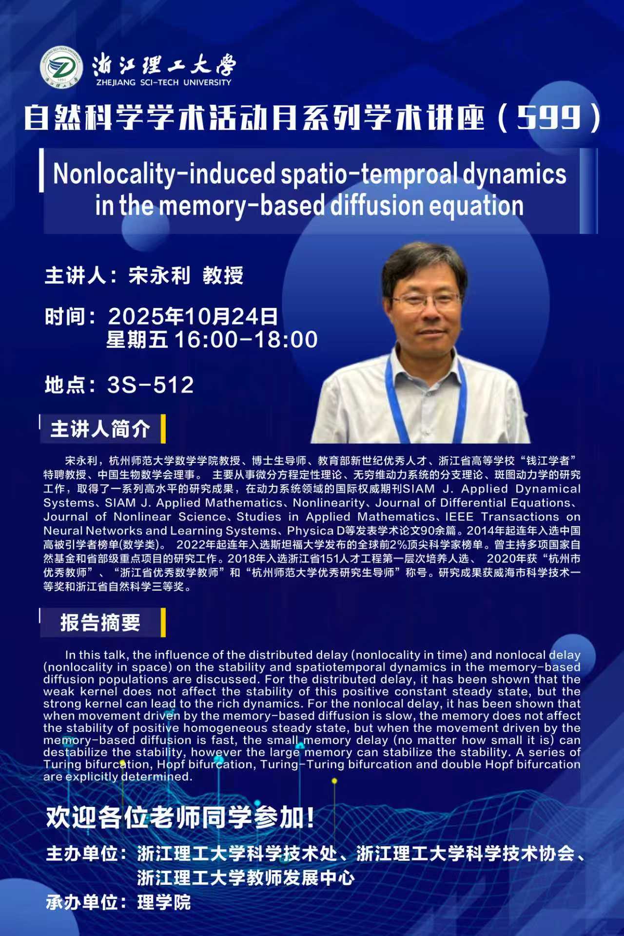 上一条:2025-10-31-湘潭大学-刘建州-可稳定情况下不同条件下冗余控制输入问题的统一研究 下一条:2025-10-24-加拿大纽芬兰纪念大学-赵晓强-Propagation dynamics of reaction and diffusion equations in a time-heterogeneous shifting environment