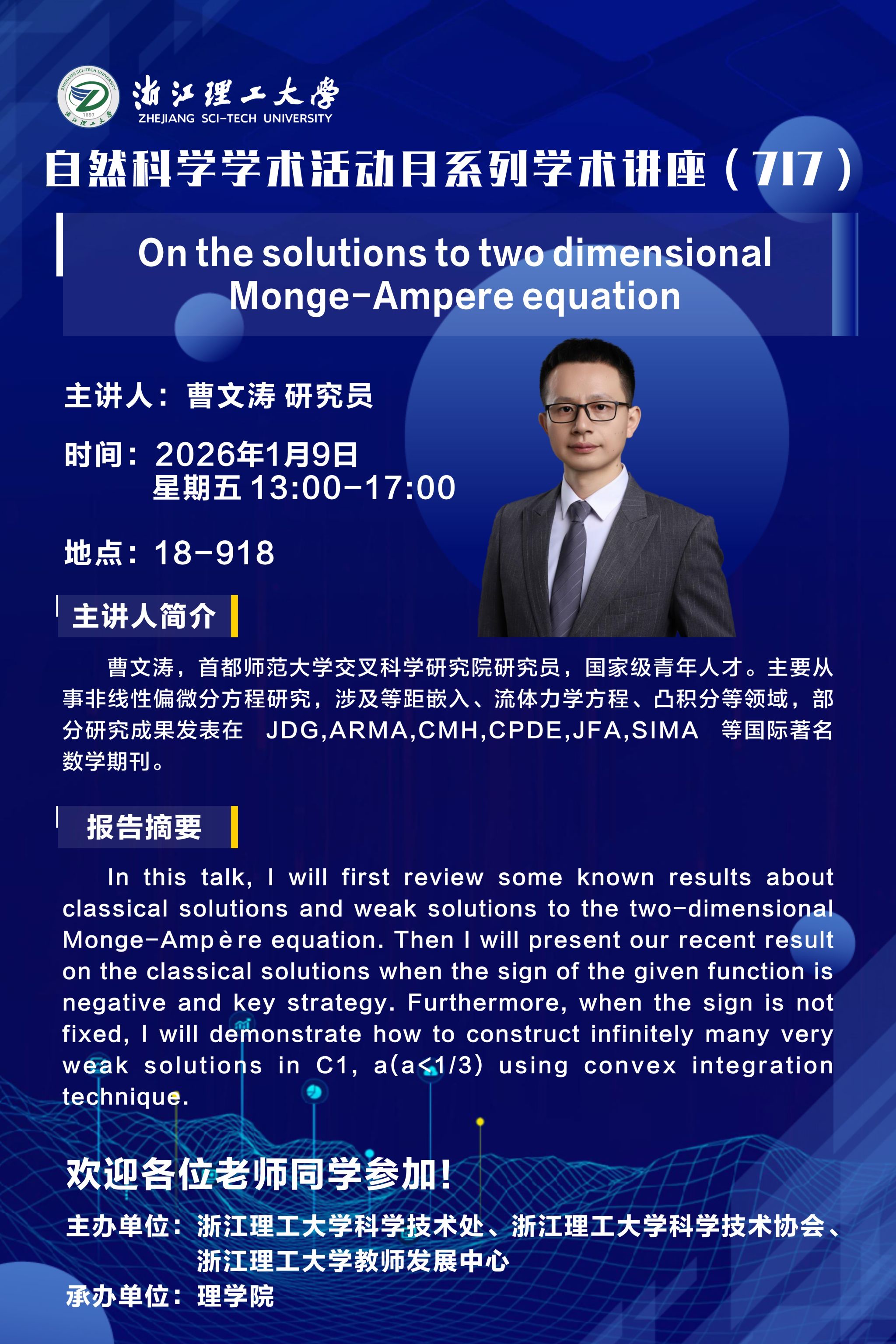 上一条:2026-1-14-江苏师范大学-刘伟-Regularization by Nonlinear Noise 下一条:2026-1-9-浙江科技大学-胡燕波-Existence and singularity formation for the supersonic expanding wave of radially symmetric compressible Euler equations