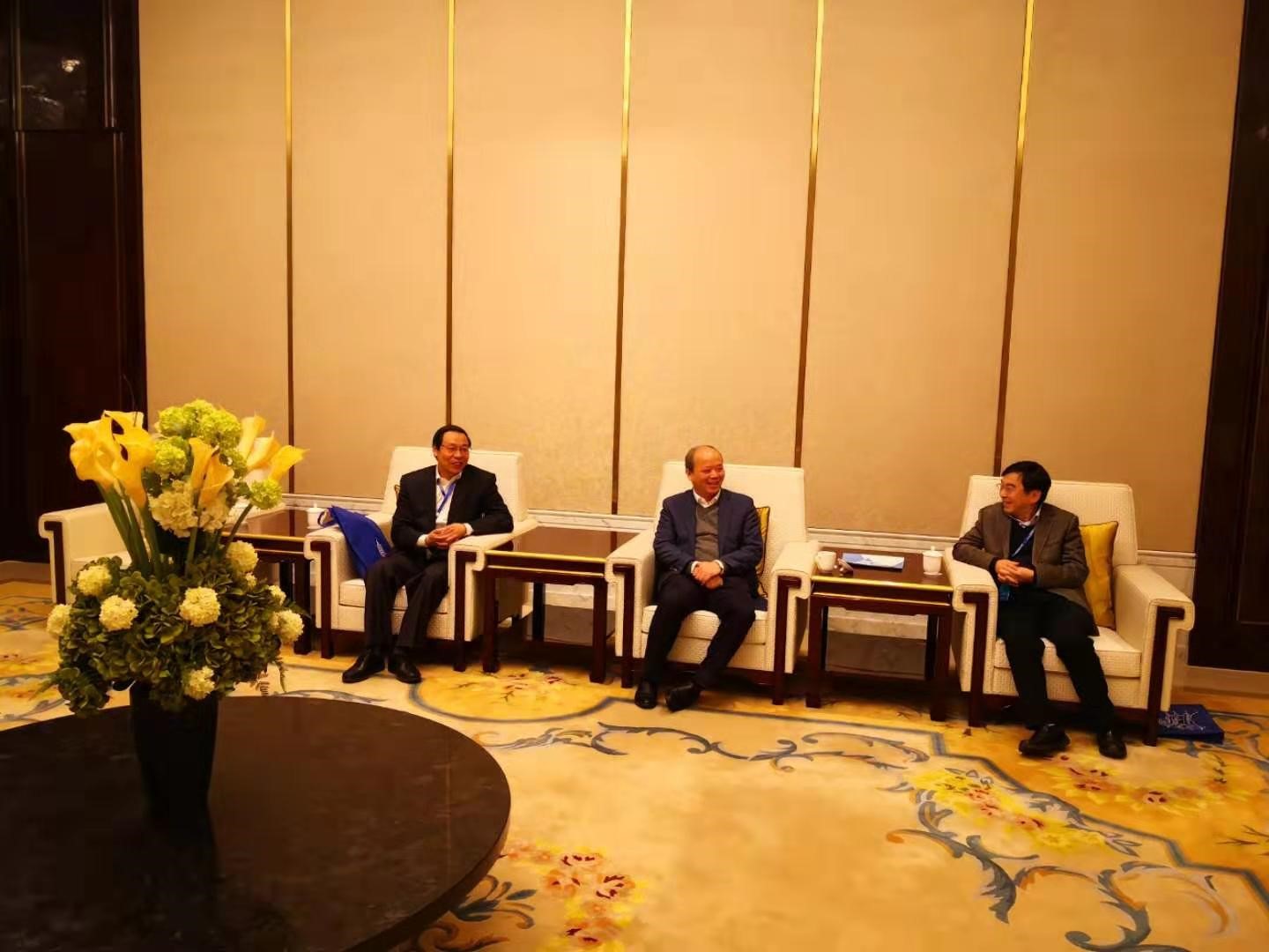 我校校长陈文兴院士与高等教育出版社林金安副总编辑、南京航空航天大学施大宁副校长在会前亲切交流