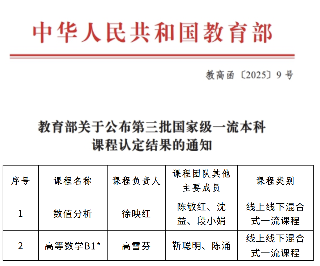 近日,教育部正式发布《教育部关于公布第三批国家级一流本科课程认定结果的通知》(教高函〔2025〕9号),我院两门课程成功入选。截至目前,我院国家级一流本科课程总数已增至4门,标志着学院课程建设水平迈上新台阶。
