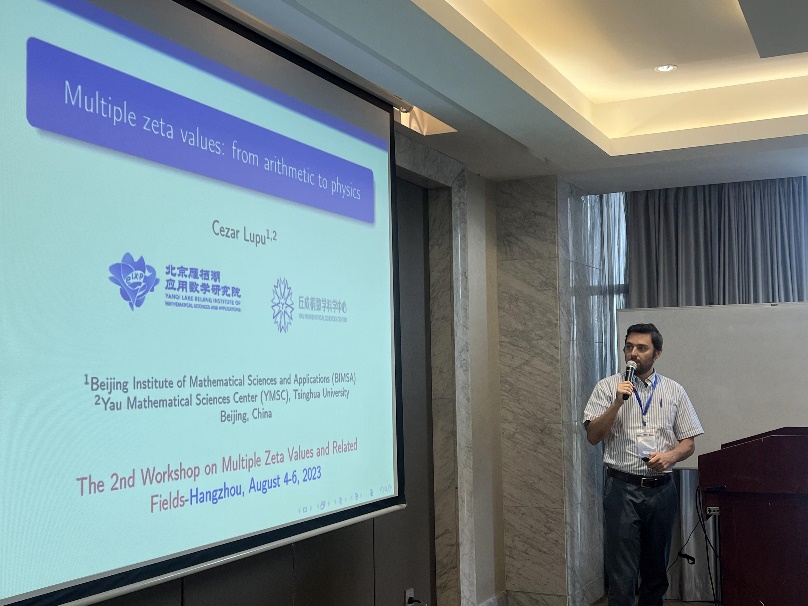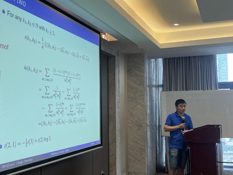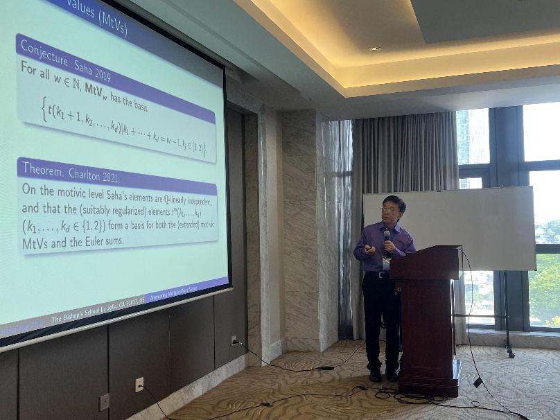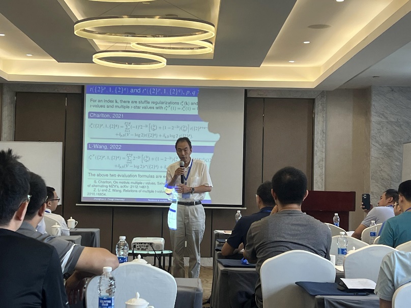 在研讨会中,德国波恩大学区锦昌博士、日本九州大学金子昌信教授、北京大学赖力博士、同济大学李忠华教授、北京雁栖湖应用数学研究院Cezar Lupu博士、南京大学孙智伟教授、合肥工业大学吴小胜教授、四川大学向洪玉博士、西南大学喻厚义教授、四川大学张斌教授、美国毕夏普学校赵健强博士、北京大学周亚俊教授等12位学者做了特邀报告,报告内容涉及数论、代数、组合、几何等多重zeta值相关领域。专家们从多方面、多角度介绍了多重zeta值的历史背景和研究方法,就多重zeta值及相关领域的研究成果和前沿课题进行了分享与探讨,并交流了国内外相关领域的最新发展与未来趋势。与会专家、学者、研究生展开了广泛而深入的讨论。浙江大学蔡天新教授、美国罗格斯大学郭锂教授、德国哥廷根大学Preda Mihăilescu教授也应邀参加了研讨会。